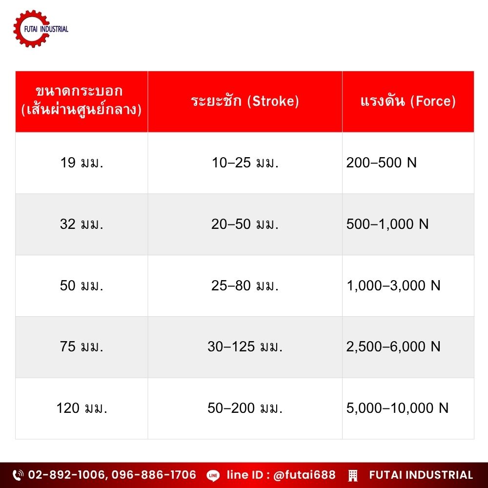 การเลือกขนาดที่เหมาะสมจึงต้องพิจารณาจากแรงดันที่ต้องการ ระยะชัก และพื้นที่ติดตั้งในแม่พิมพ์ เพื่อให้ระบบทำงานได้มีประสิทธิภาพสูงสุดและปลอดภัย