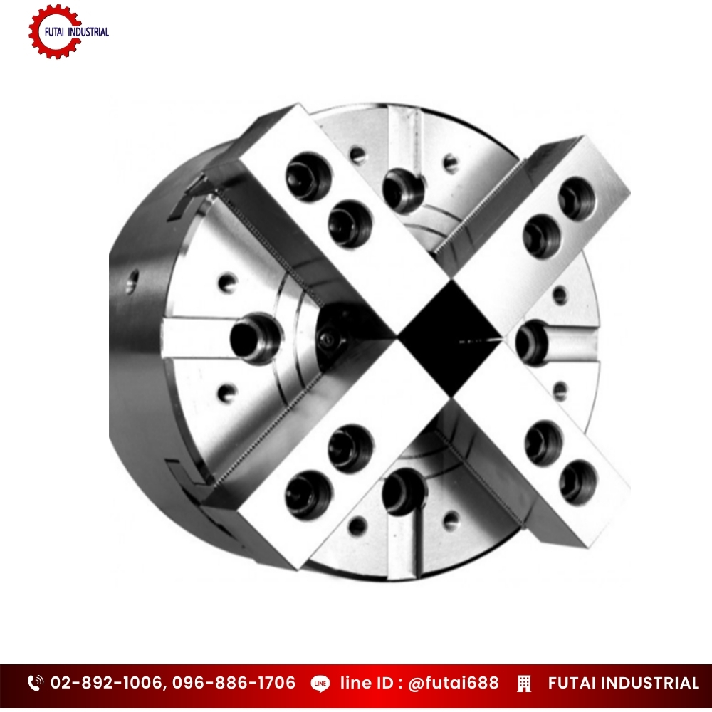 เป็นหัวจับสำหรับงานกลึงที่มี ขากรรไกร 4 ตัว และมี รูทะลุ (Through Hole) กลางบอดี้ เพื่อรองรับการป้อนวัตถุดิบยาว เช่น เพลา, ท่อ, บาร์เหล็ก ผ่านสปินเดิลด้านหลังเครื่อง CNC Lathe เหมาะกับงานที่ต้องการ จับชิ้นงานสี่เหลี่ยม สี่ด้าน ที่หัวจับสามจับไม่เหมาะกับงานประเภทนี้ - สี่จับไฮดรอลิกรูตัน 4-Jaw Hydraulic Chuck Standard Type คือหัวจับที่มี 4 ขากรรไกร (4 Jaws)