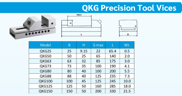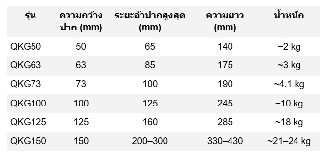 ปากกาจับชิ้นงาน QKG มีให้เลือกหลายขนาด ตามความกว้างของปากจับ (Jaw Width) เพื่อให้เหมาะกับลักษณะงานที่แตกต่างกัน ขนาดยอดนิยม ได้แก่