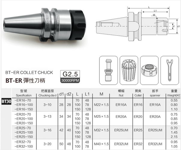 ปกรณ์จับยึดเครื่องมือตัด (Cutting Tool Holder) มาตรฐานสูง ที่ใช้สำหรับจับดอกเอ็นมิล (End Mill), ดอกสว่าน หรือเครื่องมือต๊าป เข้ากับแกนหมุนของเครื่อง CNC Machining Center โดยใช้ระบบยึดแบบ BT taper (เช่น BT30, BT40, BT50) และใช้ ER Collet (ลูกคอลเล็ท) เป็นตัวบีบจับยึดเครื่องมือ ซึ่งมีความยืดหยุ่นในการจับขนาดก้านเครื่องมือที่แตกต่างกันได้สูงให้ความแม่นยำสูง (Runout โดยทั่วไป 0.01 มม. ถึง 0.005 มม.)